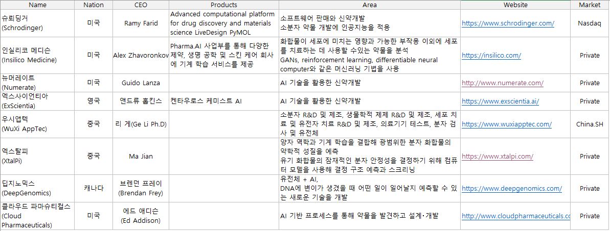 그러나 몇 시간 구글링을 해보면 이런 혁신이 슈뢰딩거만의 것은 아니라는 것은 금방 알 수 있게 된다. 아래는 검색을 통해 찾아낸 인공지능 기술을 이용한 신약 개발을 하고 있는 회사 리스트이다.