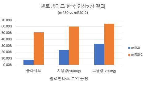 고용량 투여군을 비교해 봤을 때, 투약 후 90일과 한국 임상 2상에서의 12주 경과 후의 결과를 놓고 보면 투약을 하지 않은 경우 정상(mRS0 등급)으로 회복되는 경우는 약 26%인 반면 고용량 투약을 한 경우는 44%의 회복률을 나타냈었다.
