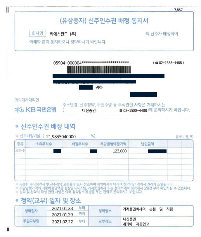 집으로 날라온 신주인수원 배정 통지서를 보니 주주배정 유상증자 참여에 대한 현실감이 새삼 느껴졌다.