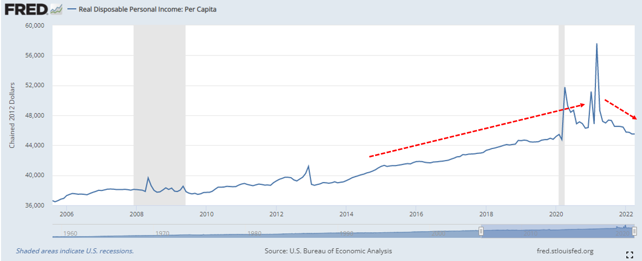 위는 미국의 1인당 가처분소득의 변화를 나타낸다. 2020년 이후 미국 정부의 재난지원금 지급으로 위로 삐쭉 솟은 부분을 볼 수가 있다. 그러나 작년 하반기부터는 계속해서 줄고 있다.