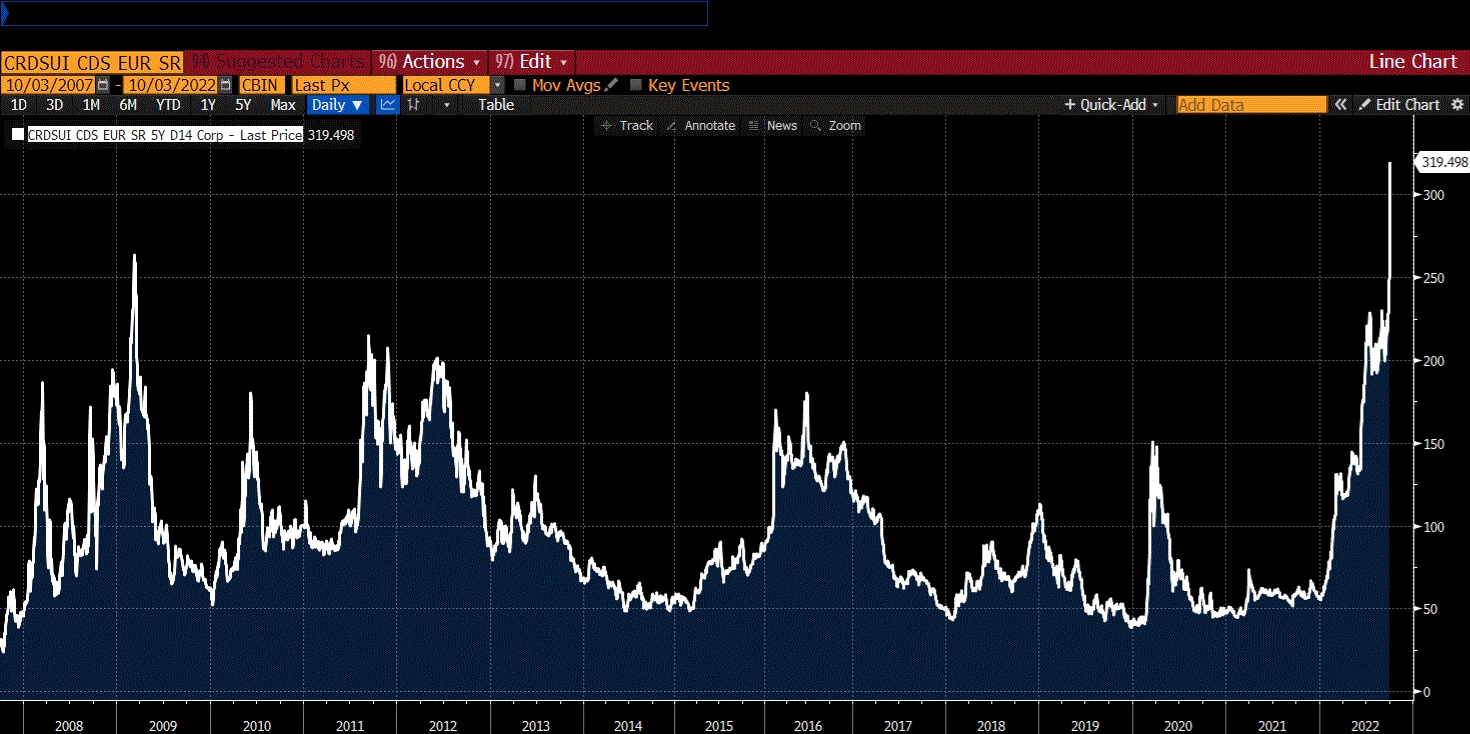 실제로 어제 CS의 5년물 CDS 프리미엄 가격은 2008년 금융위기 때 보다도 더 높은 수치를 기록했다. 이 글을 쓰는 시점에는 다소 하락했다고 하지만 여전히 높은 가격에 위치하고 있다.