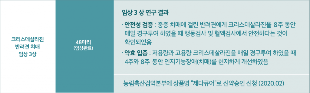 치매 치료제 크리스데살라진은 사람의 알츠하이머 치매와 거의 유사한 반려견 치매 임상 3 상 연구에서 탁월한 약효와 안전성이 입증되어 농림축산검역본부에 “제다큐어”라는 상품명으로 신약승인을 신청했습니다. 현재는 알츠하이머 치매 환자 임상을 위하여 연내에 임상승인 신청서를 제출할 계획입니다.