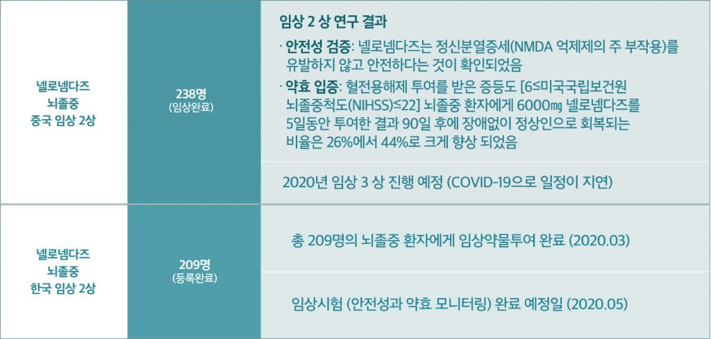 뇌졸중 치료제 넬로넴다즈의 중국 임상 2 상 연구에서 안전성과 약효가 입증되어 매우 고무적이며, 현재 중국 우한에서 촉발된 COVID-19 판데믹으로 임상 3 상 진행이 다소 지연되고 있지만 금년 3분기에는 3 상을 개시할 수 있을 것으로 예상하고 있습니다. 국내에서는 혈전제거수술을 받은 209명의 뇌졸중 환자에 대한 넬로넴다즈의 임상 2 상 시험 약물투약을 모두 완료했습니다. 관련하여 넬로넴다즈 및 유도체의 재개통(再開通) 뇌졸중 환자의 치료에 대한 우선권 특허를 미국에 출원했습니다.