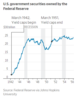 몇 개월 전, 워싱턴 포스트에서 Fed가 세계 2차 대전 때 썼던 일드 캡(Yield cap) 사용할 수도 있다는 가능성 제기했다. 2차 대전 당시 1942~1951년에는 단기 채권, 나중에는 장기 채권에도 Yield Cap 확대해서 금융 전쟁 도왔던 기록이 있다.