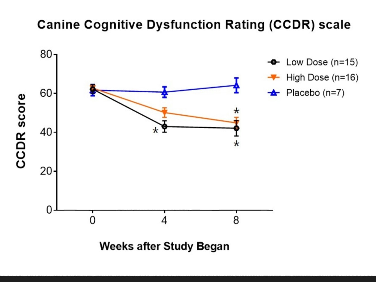 플라시보군은 4주, 8주째에 인지기능이 악화되지만, High Dose, Low Dose는 개선이 됨을 확인할 수 있다. 다만, 40 미만으로는 떨어지지 않는 것으로 보아 정상 상태로까지 회복되는 것은 확인할 수 없다. CCDR Scale에서 말하는 'At Risk' 상태라고 판단하는게 맞다.