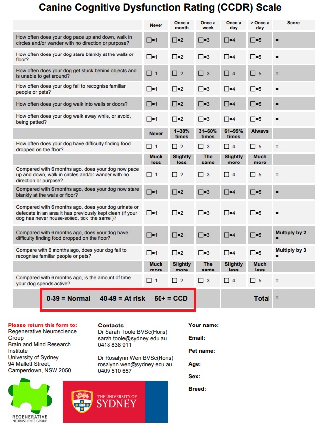 위에 붉은색 박스에서 확인할 수 있듯이 50점 이상은 CCD. 즉, 반려견 인지 장애 상태이다. 40~49점은 인지 장애 상태는 아니지만 위험 레벨이라고 정의하며, 39점 이하라야 정상으로 판정한다.