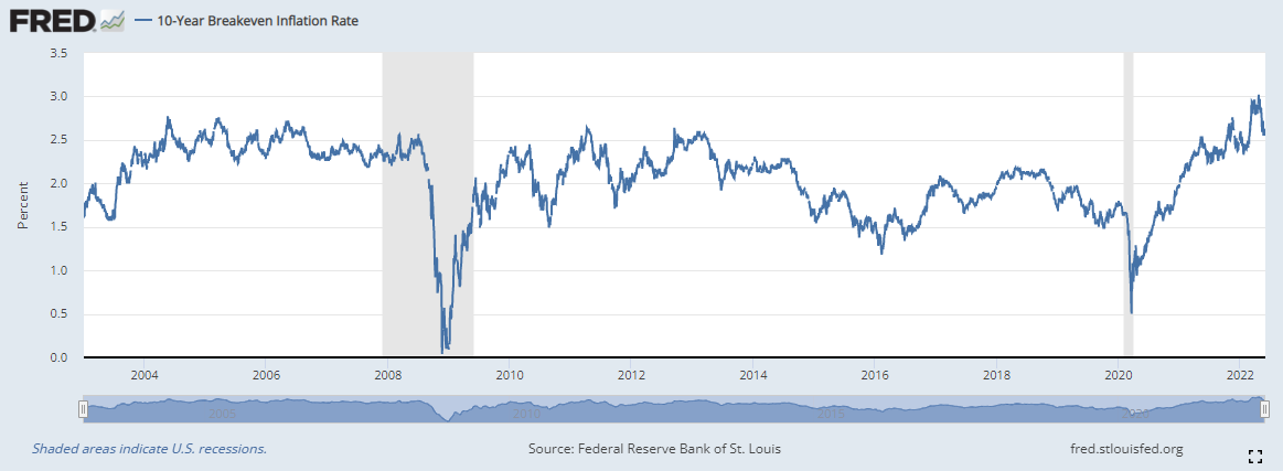 최근 3%에 근접했는데, 이는 과거 20년 안에는 본적이 없는 수치이다. 연준에서는 이 10년 BEI가 3%는 넘는가를 기준으로 더 적극적인 금리 인상을 할지 말지 고민하고 있는 것으로 알려져 있다.