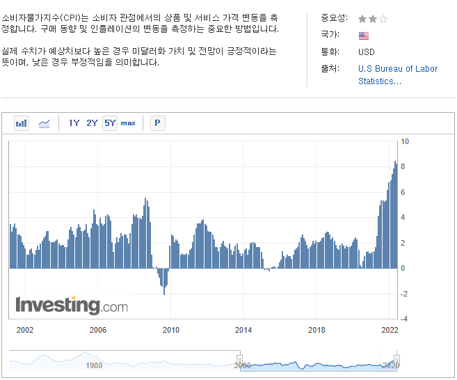 잘 알려져있다시피 최근 몇달 인플레이션 수치는 급등하고 있다. 가장 최근은 5월 발표된 미국 CPI는 8.3%로 1980년대 초 이후로 가장 높은 수준이다. 문제는 이게 정점을 찍었는지를 봐야하는데, 원유나 천연가스 등 에너지 가격은 내려올 기미가 없고 밀이나 옥수수, 팜유와 같은 농산물 원자재 가격도 전쟁의 영향으로 계속해서 상승하고 있기 때문에 물가의 하락은 요원해 보인다.